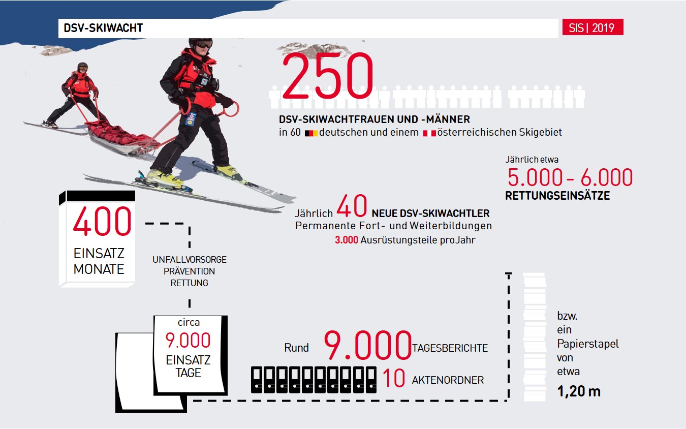 In deutschen Skigebieten sind 250 Skiwachtfrauen und -männer für die Sicherheit der Skifahrer, Snowboarder und Langläufer im Einsatz. Seit über 40 Jahren sorgen eingespielte Teams mit hoch qualifizierter Ausbildung und Erfahrung für den reibungslosen Ablauf im Wintergeschehen.