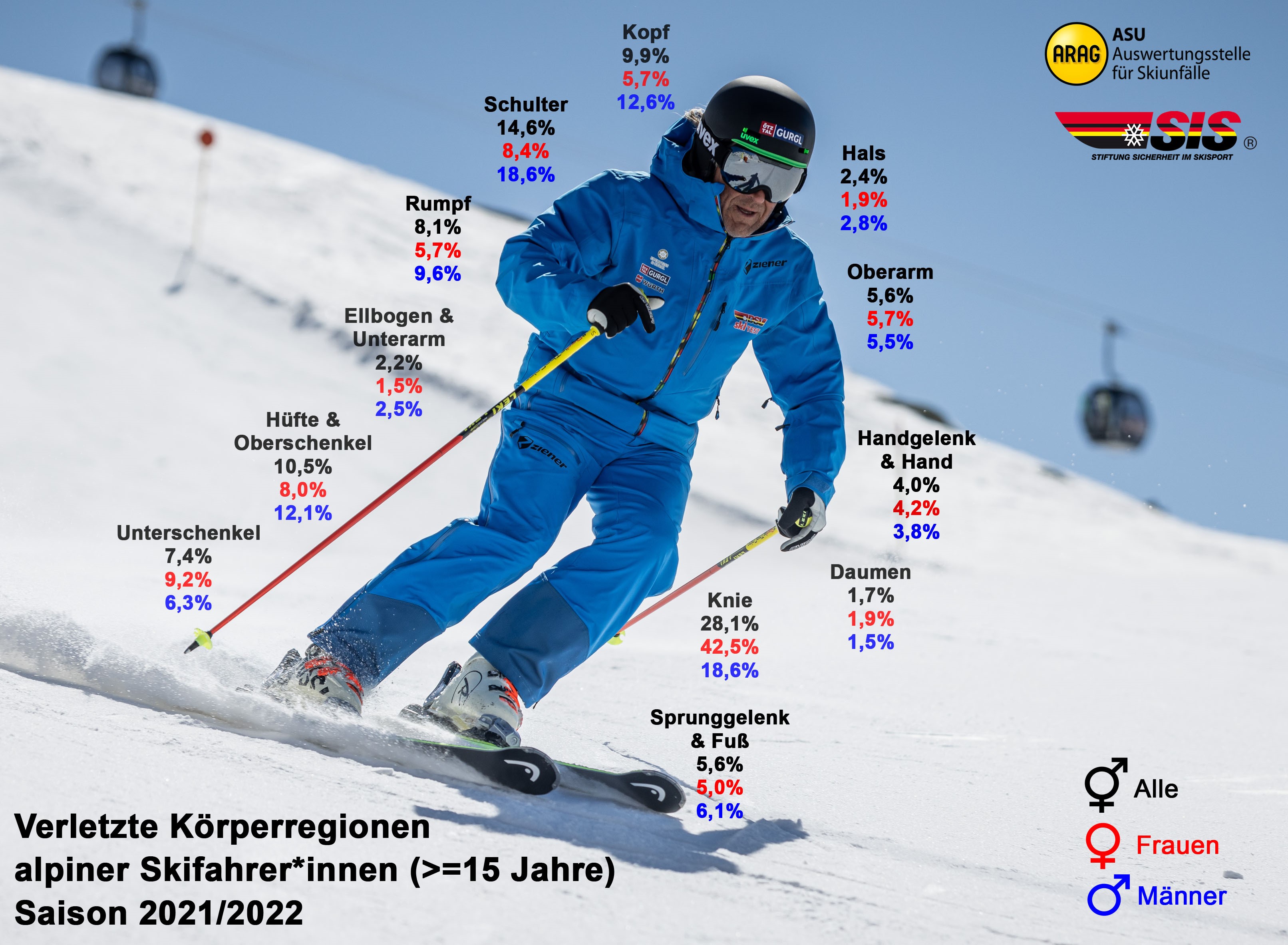 von der Auswertungsstelle für Skiunfälle (ASU Ski) der ARAG Allgemeine Versicherungs-AG erstellt. Erstmals in dieser langen Geschichte der ASU Ski musste im Winter 2021 die Entscheidung getroffen werden, dass die Anzahl der erfassten Skiverletzungen aufgrund der pandemiebedingten Einschränkungen des Skisports zu gering war für eine sinnvolle Auswertung. In der Saison 2021/2022 war erfreulicherweise wieder ein in weiten Teilen normaler Skibetrieb möglich, was sich auch in den vorliegenden Zahlen widerspiegelt.