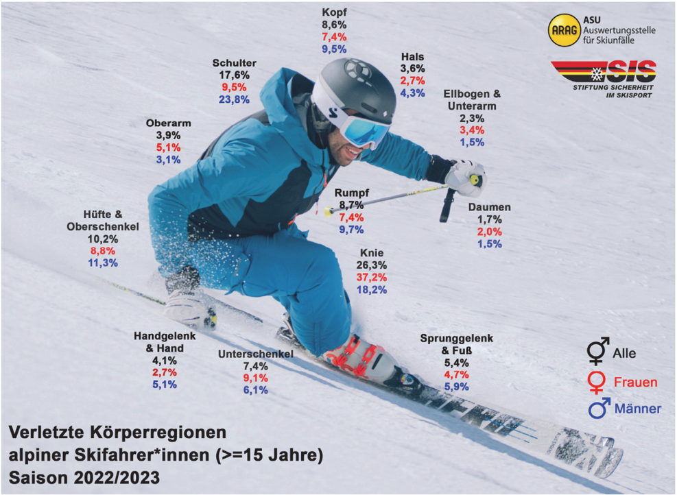 Das Risiko einer Knieverletzung sinkt von 2,94 auf 2,70 je 1.000 Skifahrer*innen. Hingegen steigt das Risiko für Verletzungen im Bereich der Schulter und Oberarme im Vergleich zur Saison 2021/22 deutlich von 1,87 auf nunmehr 2,61 je 1.000 Skifahrer*innen. Auch das Verletzungsrisiko für die Körperregionen Rumpf/Hüfte/Oberschenkel, Unterschenkel/Fuß und Unterarm/Hand steigt zum Teil deutlich.
